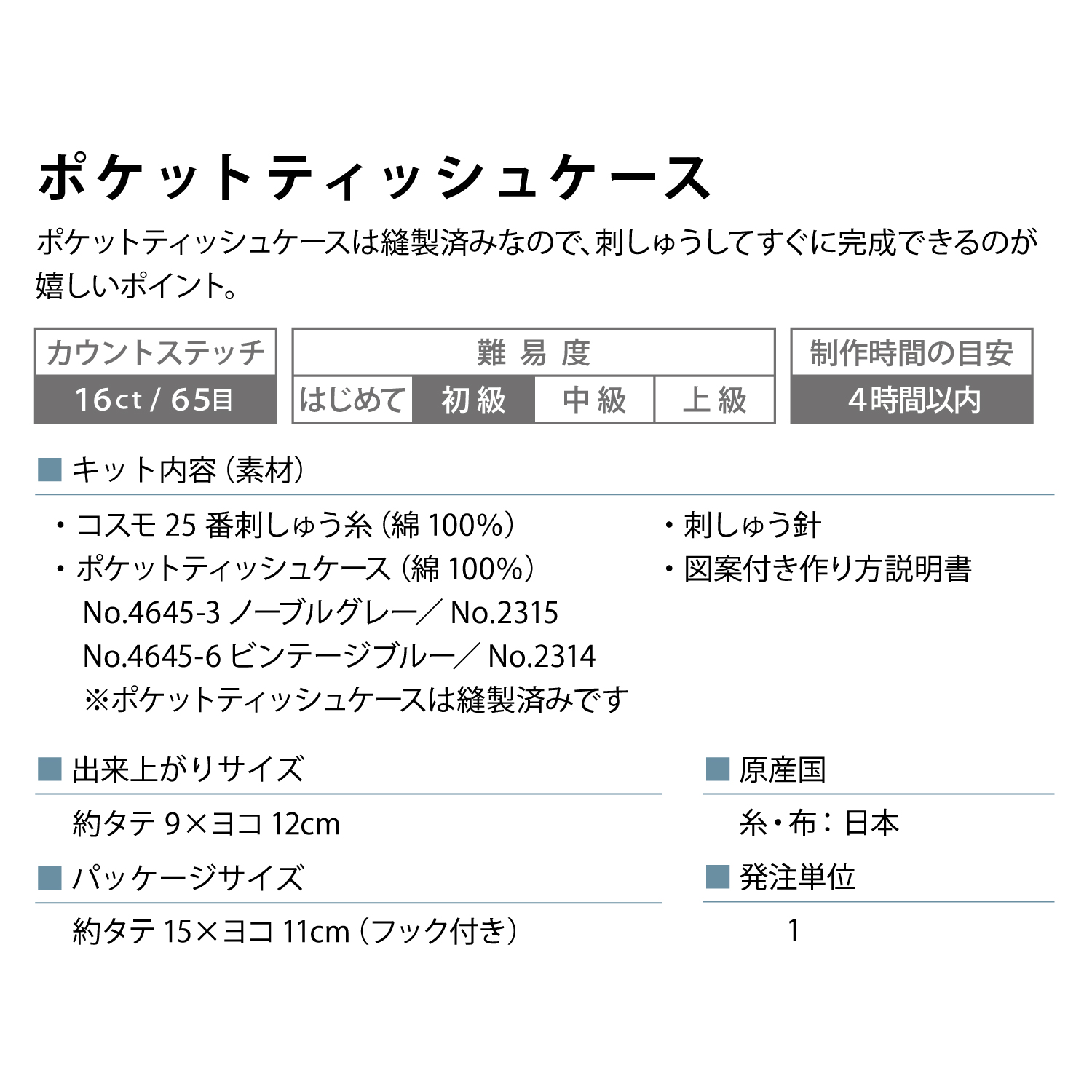 ■キット内容:25番刺しゅう糸、ポケットティッシュケース、刺しゅう針、作り方