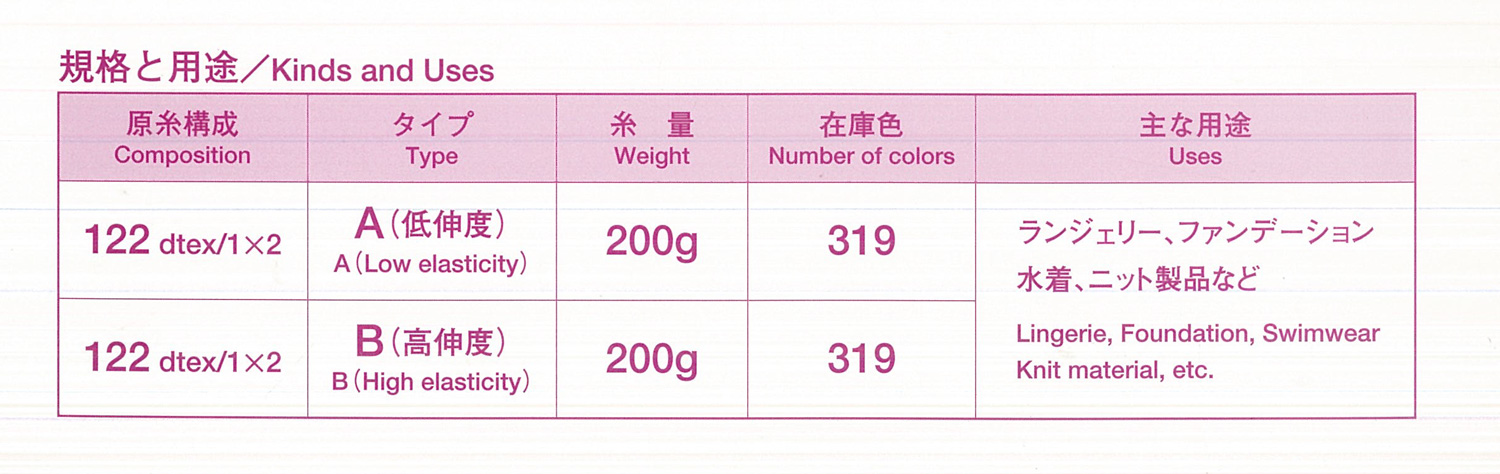 ■主な用途:ランジェリー、ファンデーション、水着、ニット製品など