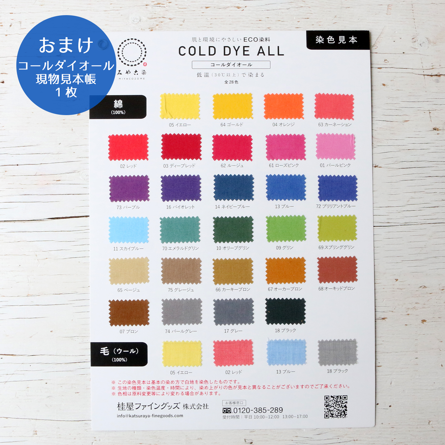 低温(30℃以上)で手軽に染められる染料と綿麻レーヨンを染色をした後、使用する色止め剤のセットです。