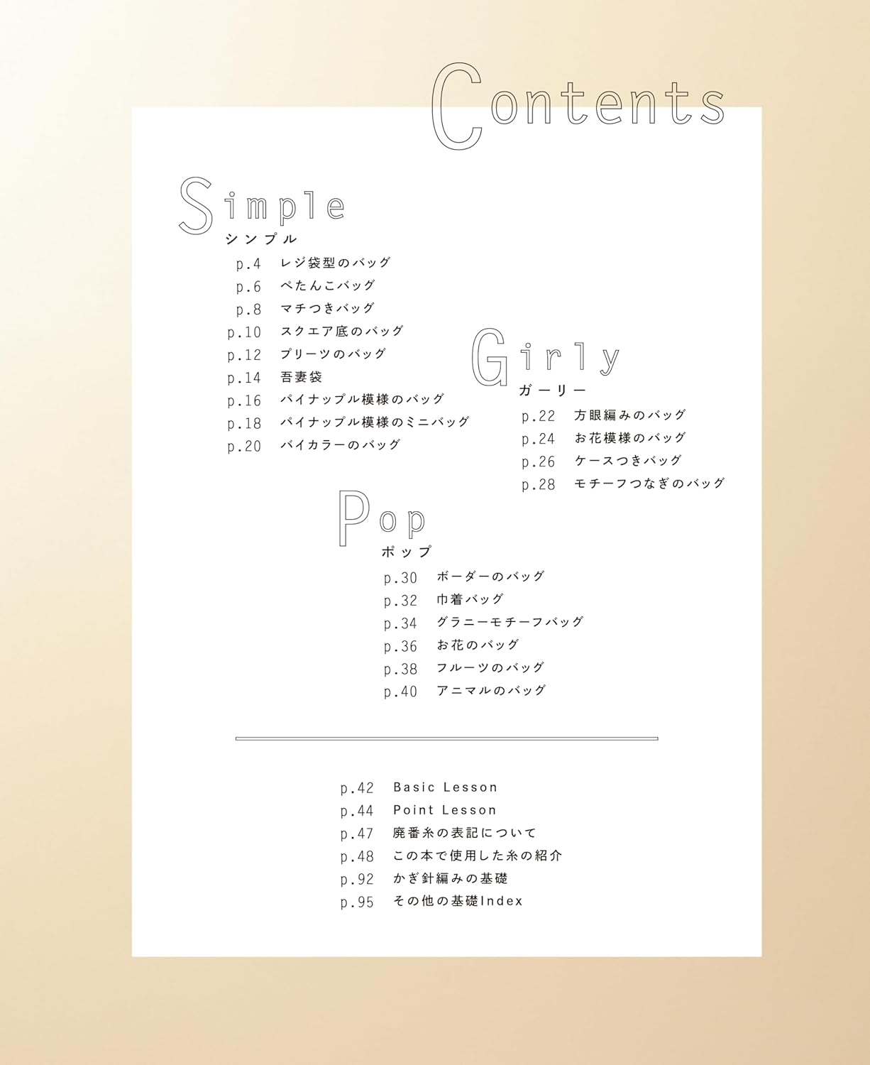 既刊本の中から読者に人気の高かった、かぎ針編みのエコバッグを厳選してまとめた再編集本。市販のものにはない"デザイン性の高さ"と気軽に編みたくなる"手軽さ"がとっても魅力的なかぎ針編みのエコバッグ。ちょっとしたお買い物からランチバッグまで幅広く使えるサイズ感で、コンパクトにたためて使い勝手も抜群なエコバッグをたっぷりご紹介します。デザインによってはお好みで持ち手の長さや本体(幅・深さ)のサイズ調節が可能なところも嬉しいポイントです。レース糸やコットン糸をメインに使用し、軽さと耐久性を両立。この本で使用した糸、編み目記号とその編み方の基礎なども詳しく解説します。写真での詳しいポイントレッスンつき。