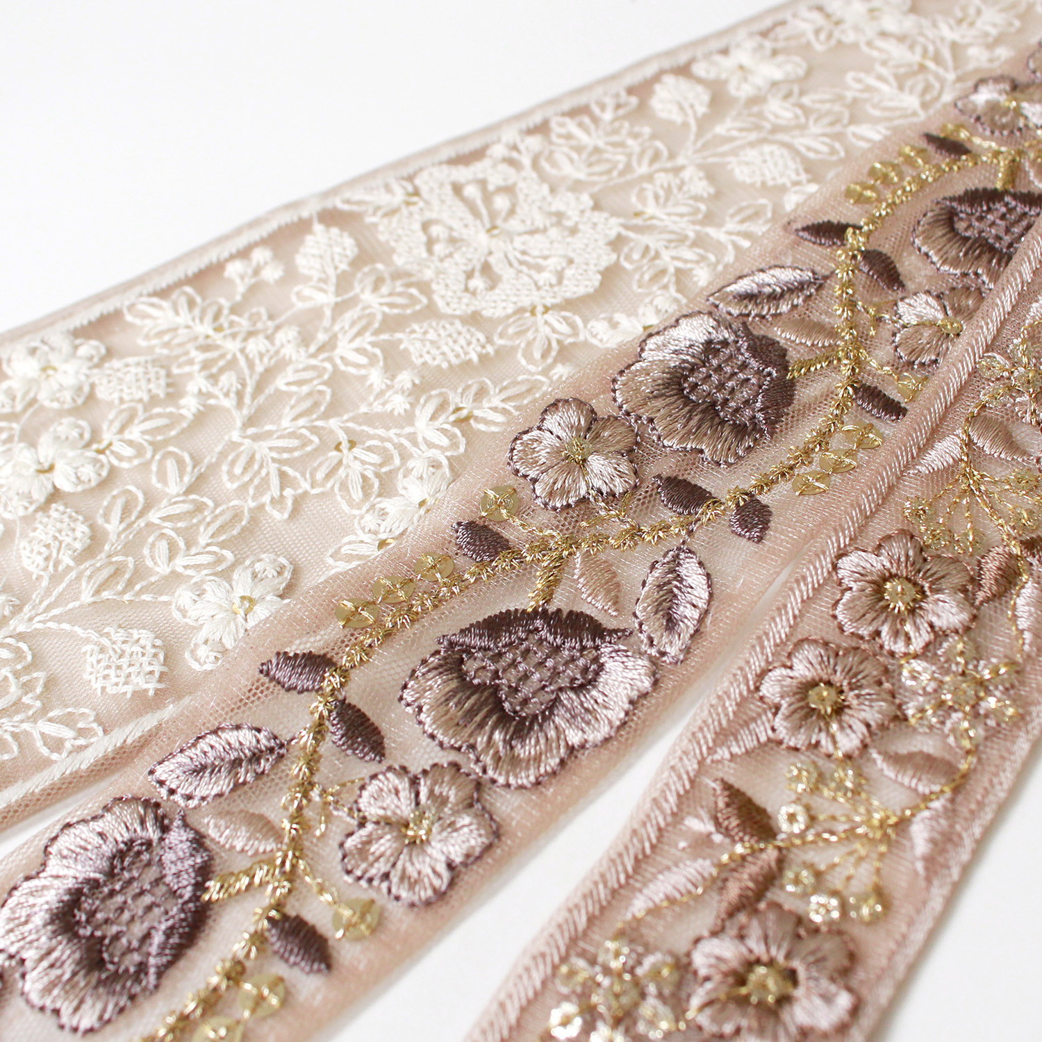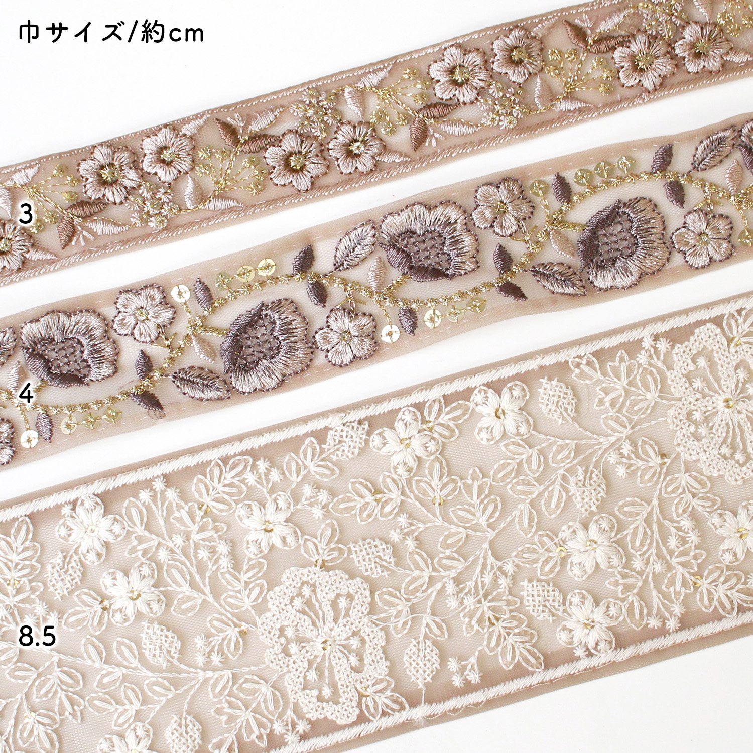 KF-RMIX-137 インド刺繍リボン ベージュアソート 約30cm×3本 (袋)